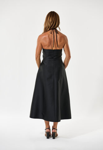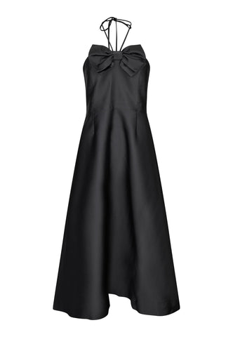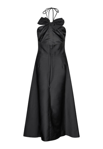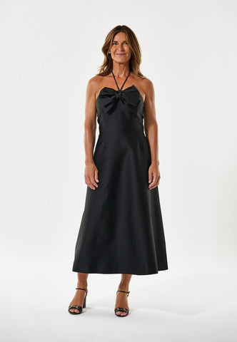 The ultimate cocktail party outfit, this black taffeta dress has a fitted bodice that flares out into a skirt that falls to mid calf. The bustier top is decorated with a large decorative bow and shoe-string straps can also be used to tie at the back of the neck. The back of the dress is scooped low and fastened with a covered zip.