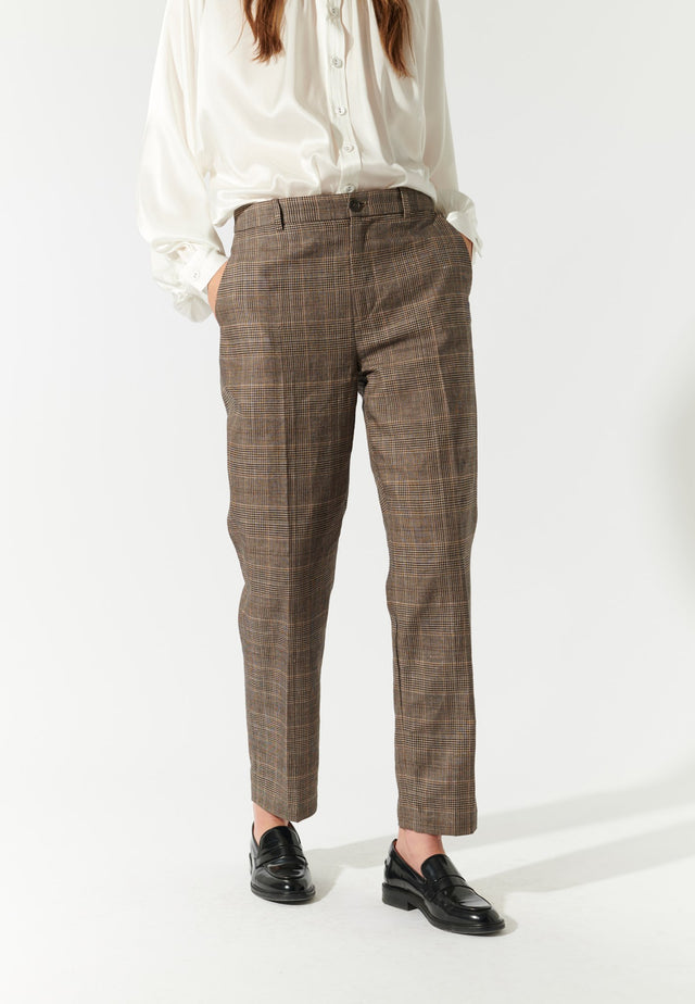 A simple pair of slim fit cigarette pants is always an elegant wardrobe option. This pair in a linen/cotton check are cropped to the ankle and have side and back pockets with a button. They can be worn alone with a shirt or knit or matched with the Alberta blazer to make a stylish summer suit.