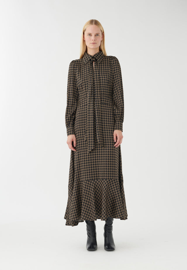 Fitted over the bodice and at the waist before flaring out into a skirt with a deep flounce, this dress is finished with a neat collar and scarf at the neck. The tiny graphic print in muted colours on silk gives the dress a timeless appeal.