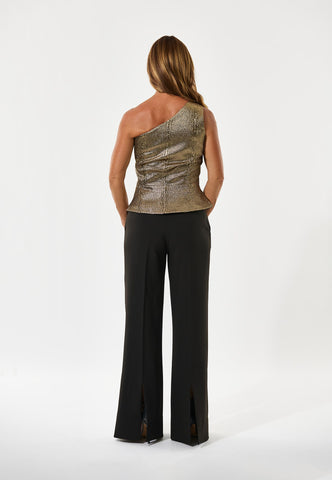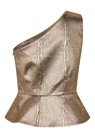 Crafted from a textured metallic brocade in a burnished gold colour, this one-shouldered top adds a bit of sophisticated glamour to the evening. Fitted close to the body, it has a seam at the waist from which it flares out over the hips. The top fastens with an invisible zip at the side.