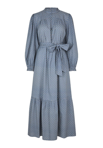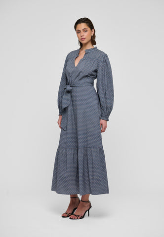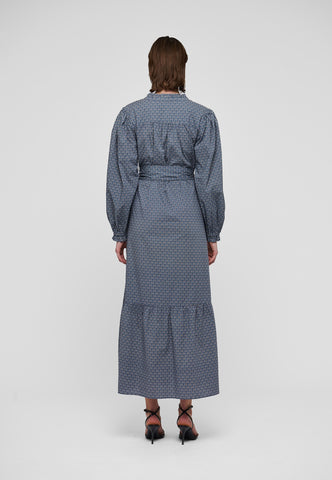 A single row of frills forms a stand collar on this elegant summer dress in cotton voile with a small floral print. Little tucks gather the body fabric into the front yoke and then falls to a long flounced skirt that is pulled into the waist with a self fabric tie belt. Volume sleeves finished with frilled cuffs add to the feminine silhouette.