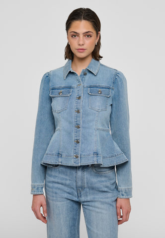 Combining utility details with an unmistakable femininity, this denim jacket has western style pockets, jeans jacket seams and metal buttons but with a fitted waist that then flares out over the hips. A small logo is embroidered at the centre back neck.