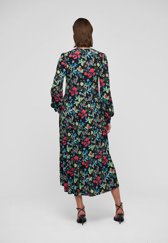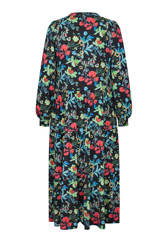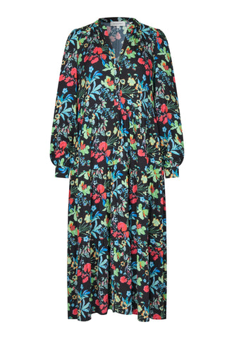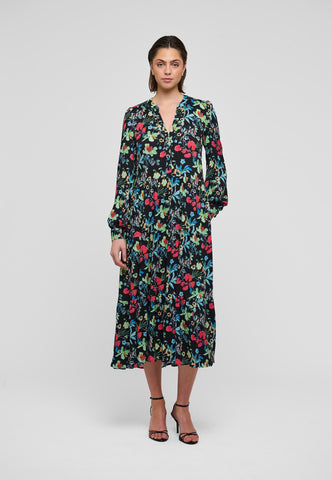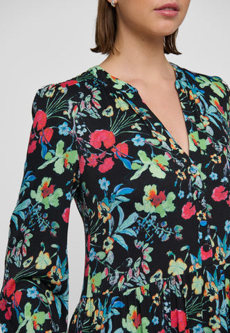 With a skirt consisting of multiple flounces, this viscose crepe dress in a beautiful print of multicoloured flowers is both feminine and easy to wear. The band collar opens into a v neck with buttons and the full sleeves end with neat cuffs.