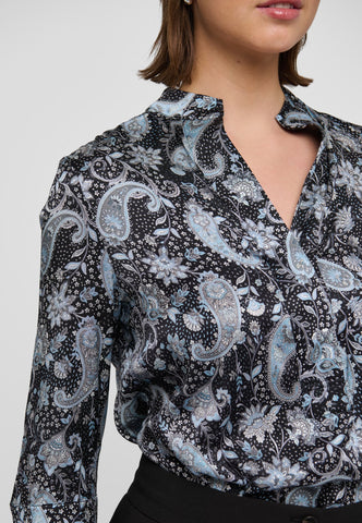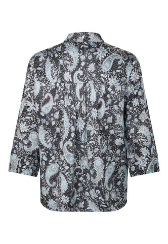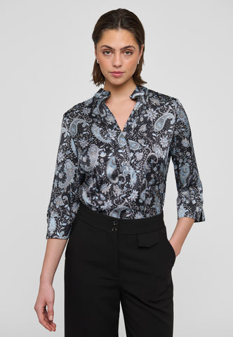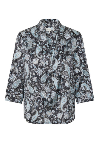 The minimalist details of this elegant regular fit silk blouse allow focus to stay entirely with the sophisticated paisley print. A stand collar leads down to a simple cross over placket whilst 3/4 length sleeves end with a deep cuff that echoes the style of a kimono.
