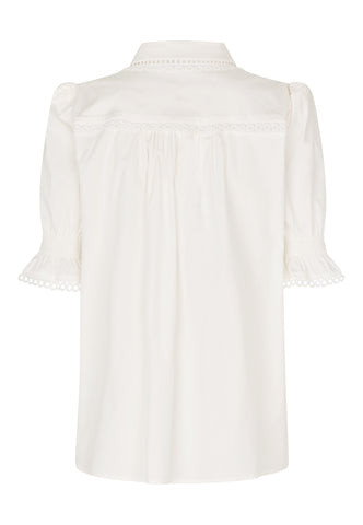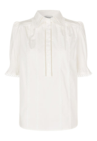 The ultimate in feminine chic, this white poplin shirt has lace trim down the front, around the collar and at the cuffs. With a regular fit, it has short sleeves that are puffed at the shoulder and elasticated at the cuff. Wear with jeans for a relaxed look or dress up with a skirt for evening.