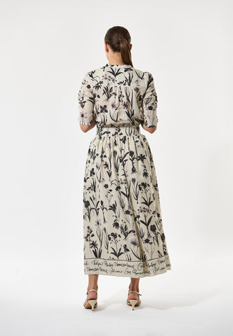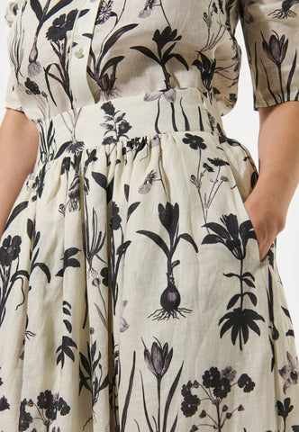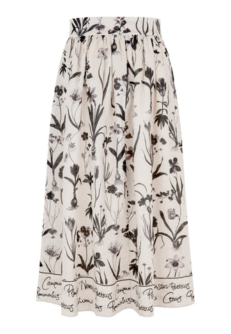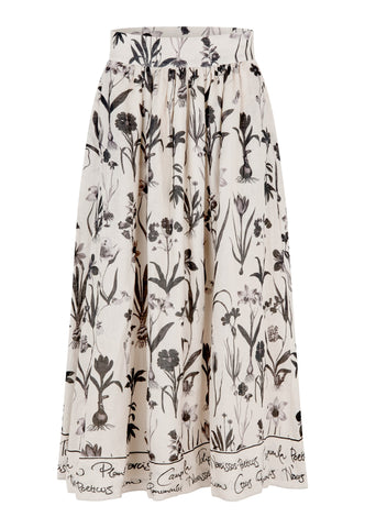 Feminine and relaxed for a summer day, this stylish linen skirt in a bold print of botanical drawings falls from a wide, high waistband to a full flared shape that ends at mid calf. A border of handwritten script adds an interesting detail. It is fully lined and there are side pockets to give an easy attitude.