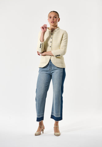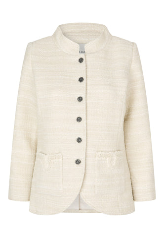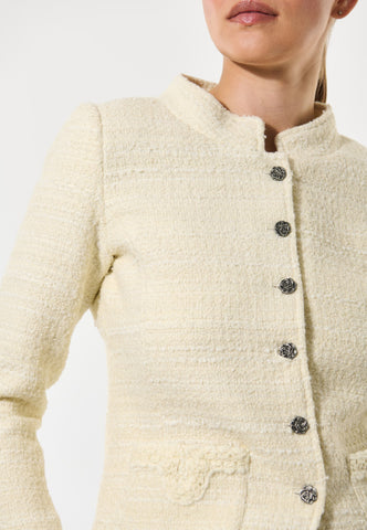A classic addition to any wardrobe, this stand collar jacket in cream wool blend bouclé fabric is chic and stylish. Regular in fit, it falls to hip length, has two patch pockets and is fastened with a row of metal buttons bearing a rose motif.