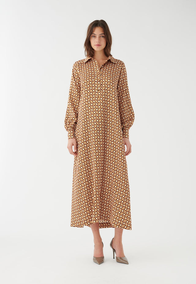 Balloon sleeves and a gently flared shape give this dress an easy but stylish silhouette. A shirt collar and side pockets add to the sense of relaxed elegance and the optical print in bright shades is a perfect touch of colour.