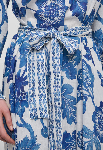 Oversized exotic blue flowers are scattered across this beautiful full length linen dress, creating something truly feminine and special. Tiny frills circle the collar and a tie belt pulls the regular fit dress into the waist. Contrast borders at the hem and cuffs and tiny covered buttons are chic finishing touches. It comes with a slip dress lining.