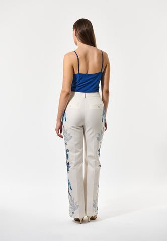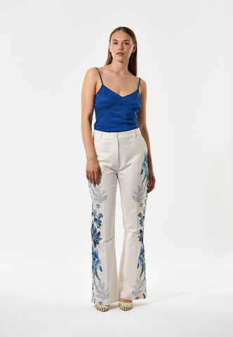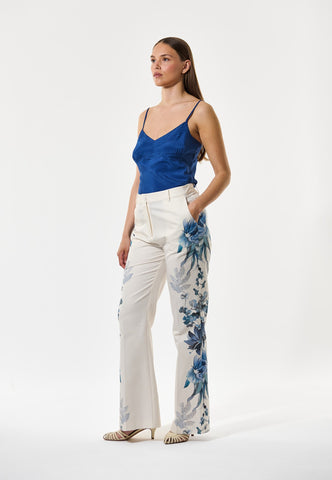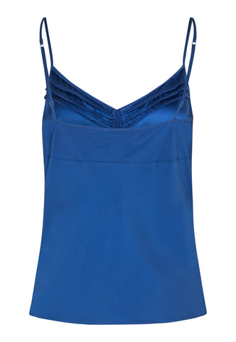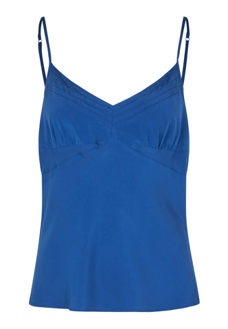 Intricate seams and tucks on the bust of this camisole ensure that the shape of this camisole top is flattering and comfortable. Made from bright blue silk, it is suspended from two adjustable spaghetti straps.