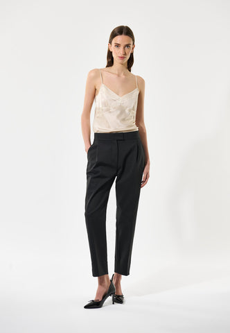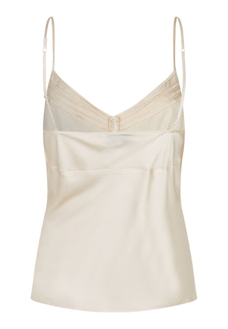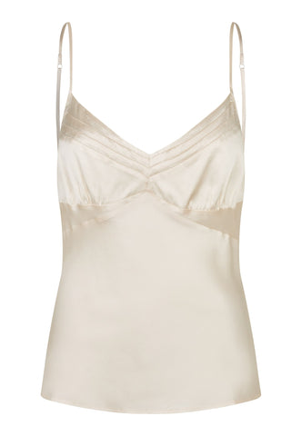 Tiny sewn down pleats run across the bodice of this delicate and feminine camisole top made from oyster silk satin. Seams accentuate the bust line and the top is suspended from adjustable spaghetti straps. Wear under a blazer or shirt for an added touch of sensual sophistication.