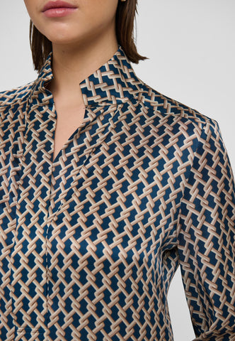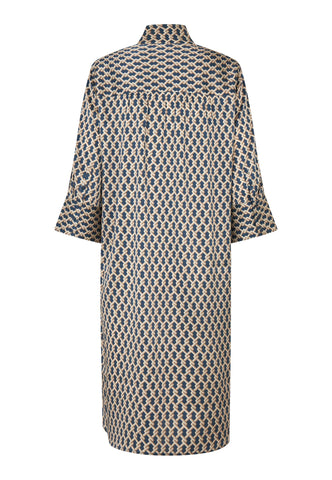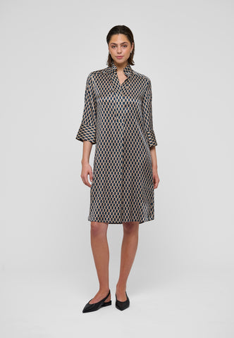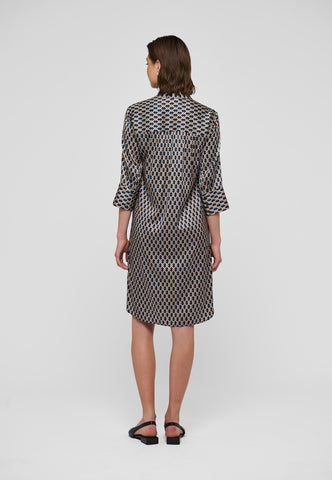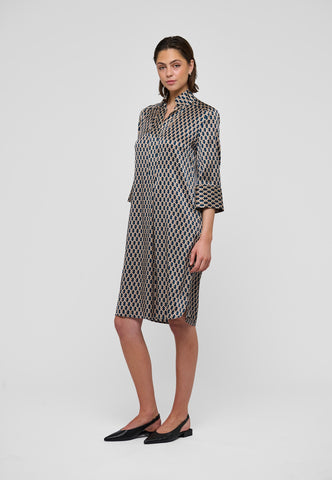 One of Dea Kudibal’s most loved and enduring styles, this easy fit mid-calf length dress is perfect for all body shapes. The kimono neckline and collar give it an elegance whilst the deep sleeves with cover buttons have a relaxed air. This sophisticated version comes in silk with a classic graphic design of interlinked shapes.