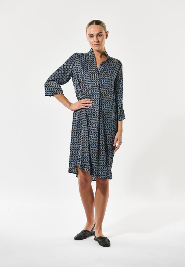 One of DEA KUDIBAL’s most popular styles, this relaxed fit mid-calf length dress is perfect for all body shapes. The kimono neckline and collar give it a sophisticated elegance whilst the deep sleeves with cover buttons have a laid back air. This chic version comes in silk twill with a subtle graphic print.