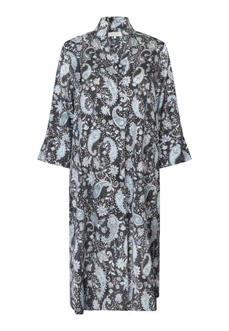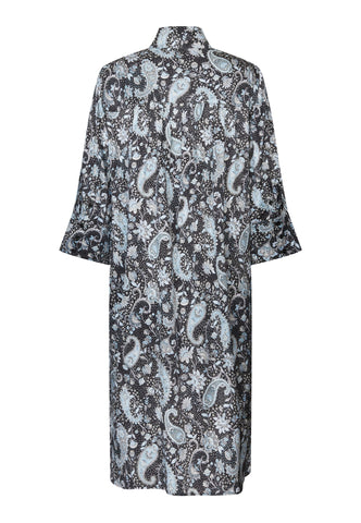 Truly one of Dea Kudibal’s most popular and timeless styles, this easy fit mid-calf length dress is perfect for all body shapes. The kimono neckline and collar give it an elegance whilst the deep sleeves with cover buttons have a relaxed air. This beautiful version is in black silk printed with an allover design of blue paisleys.