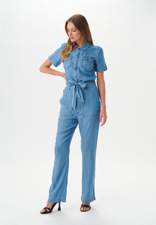 Jumpsuit with short sleeves and chest pockets. Non stretch fabric