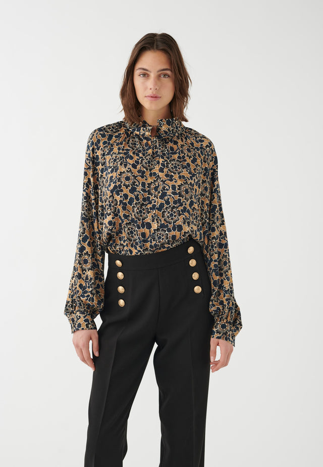 Little tucks gather the body of this printed silk blouse into a high stand collar whilst full sleeves add to the refined silhouette. The muted floral print makes the shirt perfect for both day and evening.