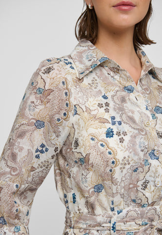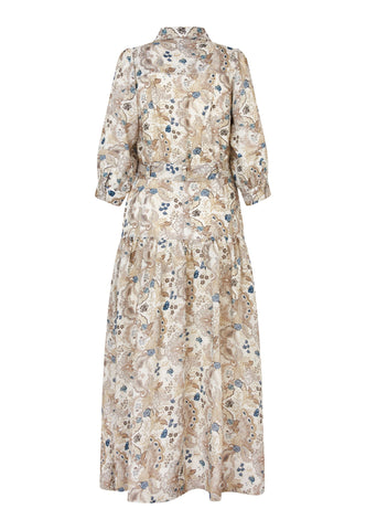 Exotic leaves and flowers printed in soft natural shades cover this full length printed linen dress. A fitted top with neat shirt collar and half placket with 3/4 length sleeves opens into a wider skirt below a waist which is defined by a self fabric tie belt. The dress fastens by a zip at the side.
