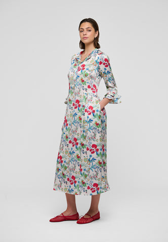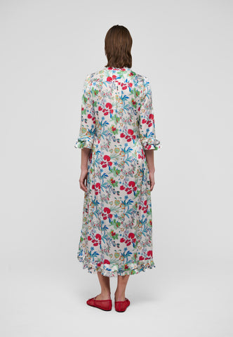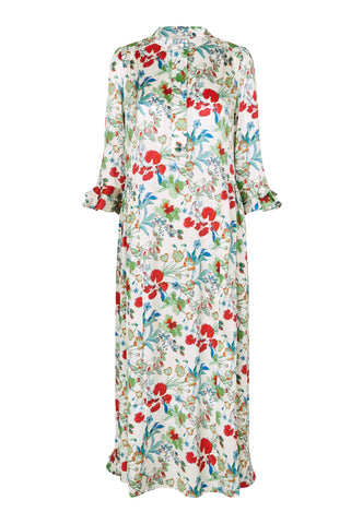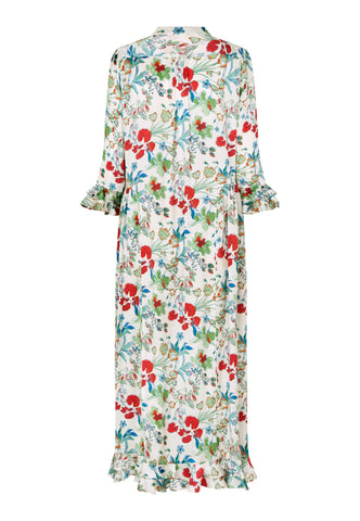 A bold print of multicoloured flowers on silk twill gives this ankle-length dress with 3/4 sleeves real impact - it is both striking and very elegant. There are double ruffles on the cuffs and at the back hem and gathering on the sleeves.