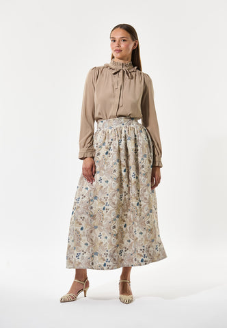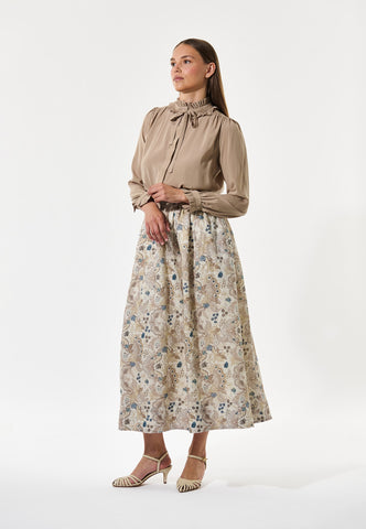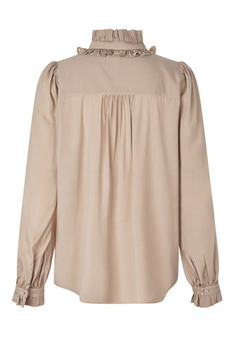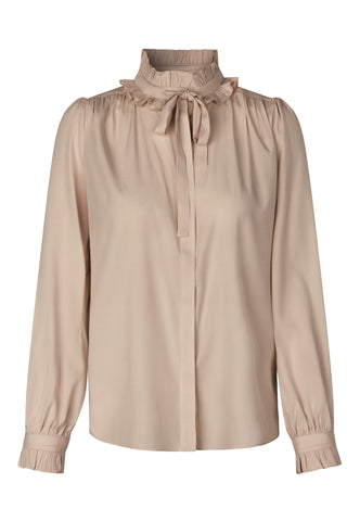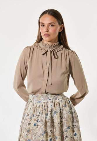 Two rows of frills held together with a self fabric bow form a dramatic collar on this chic and sophisticated blouse made from soft beige coloured silk. Full sleeves add to the silhouette and tiny frills finish off the cuffs.