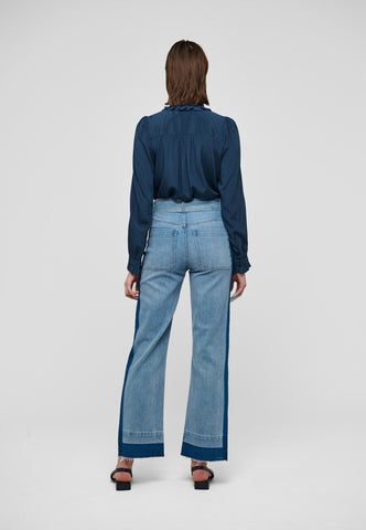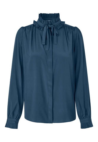 Two rows of frills tied together with a self fabric bow form a dramatic collar on this beautiful and sophisticated blouse made from midnight blue silk. Full sleeves add to the silhouette and tiny frills finish off the cuffs.