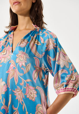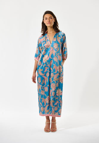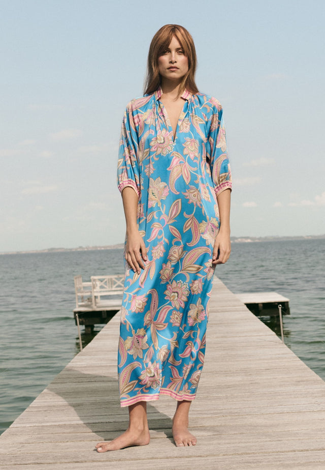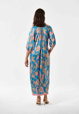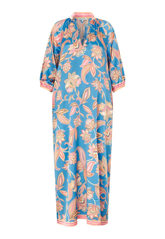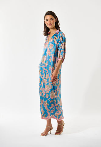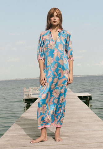 With a relaxed fit yet still elegant and flattering, this ankle length kaftan-style silk dress has a bold paisley print on a vibrant blue background. Contrast borders on the hem, cuffs and stand collar are beautiful finishing touches.