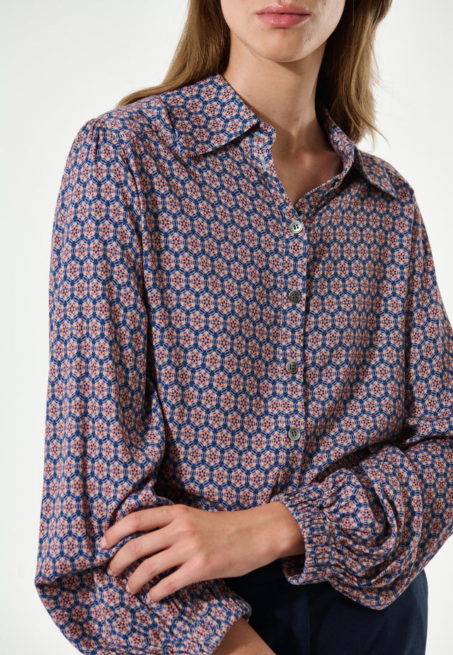 Balloon sleeves with elasticated cuffs give a feminine silhouette to this regular fit shirt in viscose printed with a small graphic floral design. It has a large collar and gathers at the shoulder whilst mother of pearl buttons add a sophisticated detail.