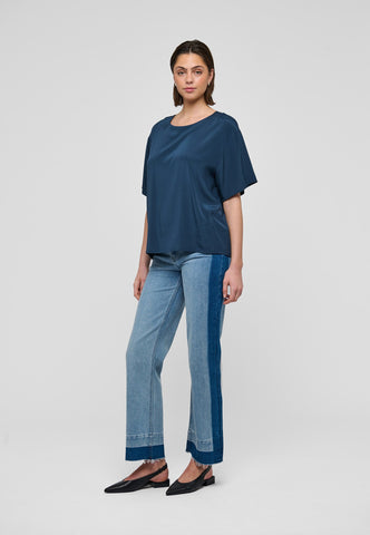 The pure minimalism of a simple t-shirt in white silk speaks for itself. Luxurious, elegant and timeless, it is in a regular fit with loose sleeves and closes with a single button and loop at the back neck. This top works perfectly under a blazer, paired with a skirt or even worn with jeans.