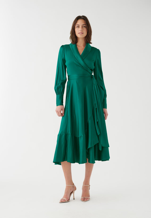 Bringing a touch of slinkiness into your wardrobe, this beautiful wrap dress has a wide flounce around the hem and front and voluminous sleeves. In a deep shade of green silk twill, it can be pulled in at the waist to give a feminine and shapely silhouette.