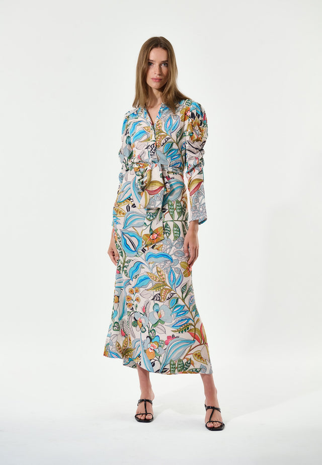 Fitted throughout the body before falling to a flared skirt pulled in with a tie belt, this crinkled viscose dress with a bold paisley print is a great summer option. It has a simple round collar and slim sleeves. The fabric contracts when washed but can be ironed out to the original size with ease.